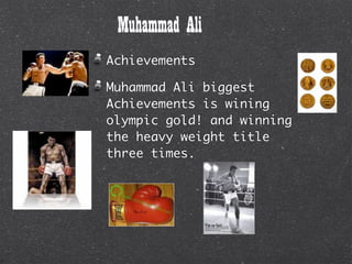 Muhammad Ali was born in January 17, 1942 in Louisville, Kentucky. His birth name was Cassius Marcellus Clay Jr. but he later changed his name to Muhammad Ali. He stands at 1.91 meters (6 feet) tall. Some of Ali's biggest achievements include winning an Olympic gold medal and winning the heavyweight boxing title three times. Ali was inspiring because he started with just a bag and no gloves but developed his famous boxing style of "float like a butterfly, sting like a bee."