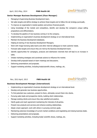 This document contains the resume of Muhammad Bilal. It summarizes his contact information, objective, specialities, work experience including roles at Allied Food Manufacture, PWB Health UK, Ufone PTML, and Telenor Pakistan. It also lists his education qualifications and skills including proficiency with Microsoft Office and communication skills in English and Urdu. Training courses are also mentioned.