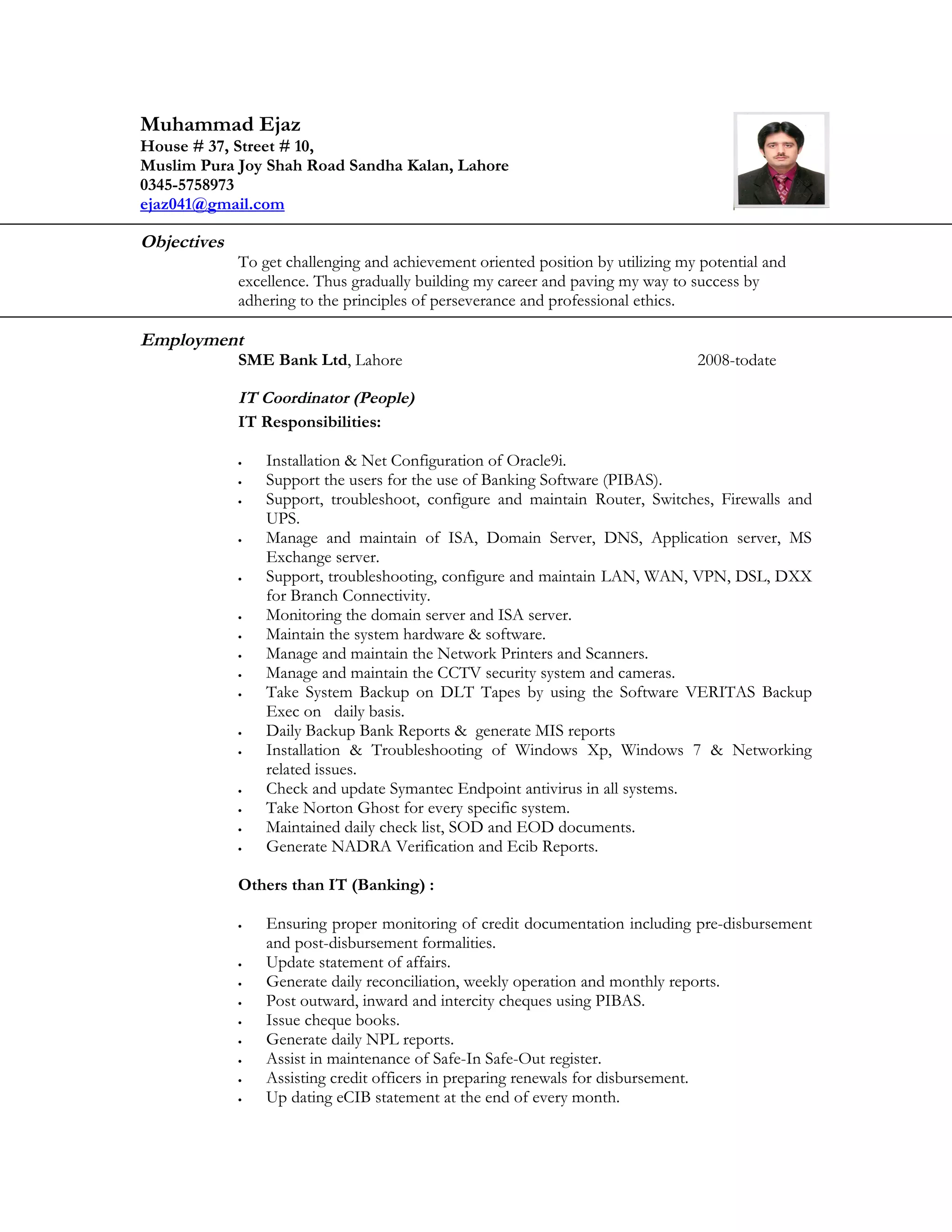 This document is Muhammad Ejaz's resume. It includes his contact information, objectives, employment history at SME Bank Ltd from 2008 to present as an IT Coordinator and in banking, education including an MSc in E-commerce from Punjab University College of Information Technology Lahore and a B.com from University of the Punjab, courses and trainings, computer skills, personal skills, personal information, and professional references.