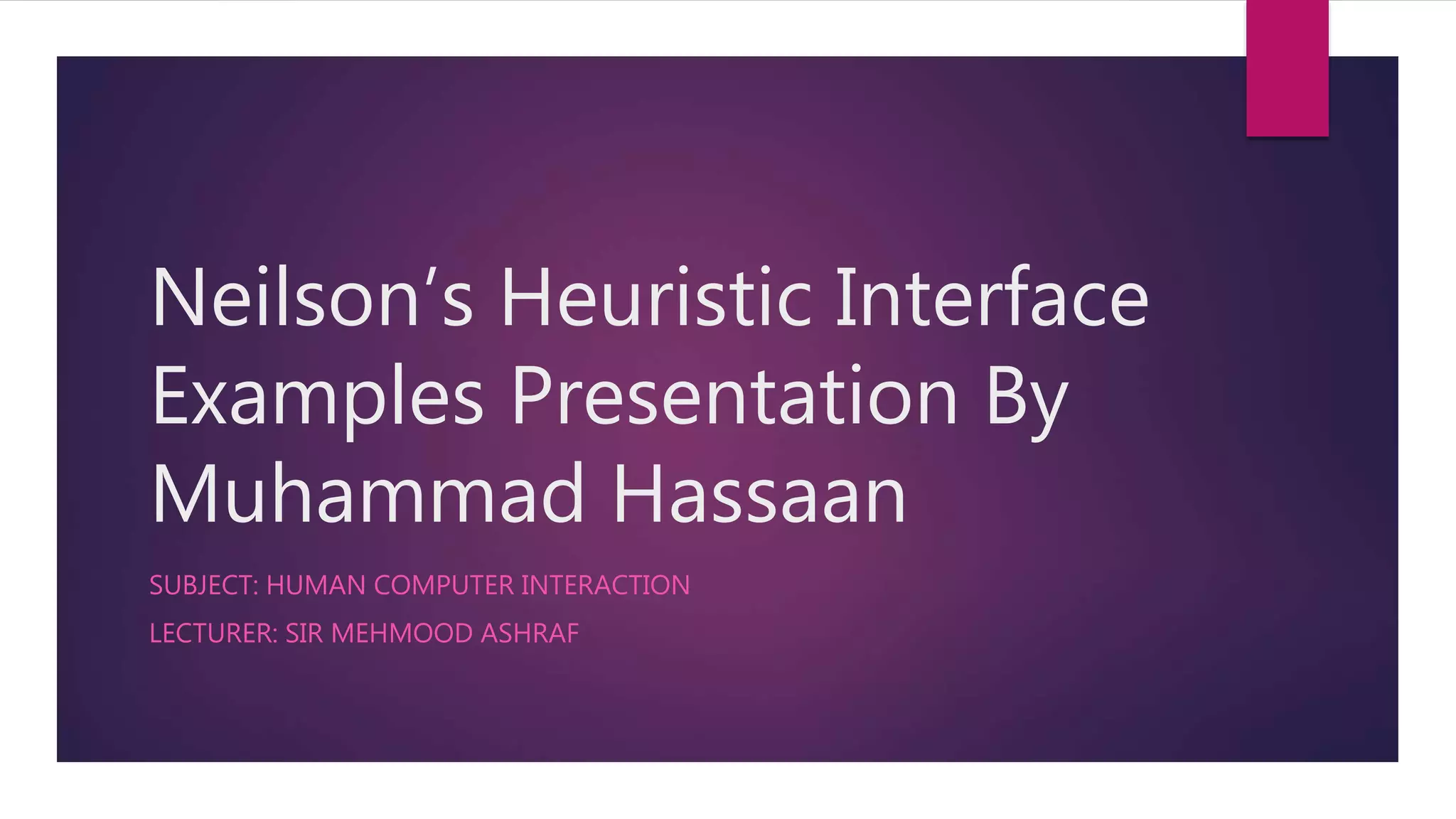 The presentation by Muhammad Hassaan discusses Neilson's heuristics in Human-Computer Interaction, providing both good and bad examples for each heuristic. These include visibility of system status, match between system and real world, user control and freedom, consistency and standards, error prevention, recognition rather than recall, flexibility and efficiency of use, aesthetic and minimalist design, help users recognize and recover from errors, and help and documentation. Each point is illustrated with real-world applications, contrasting effective designs with less effective ones.