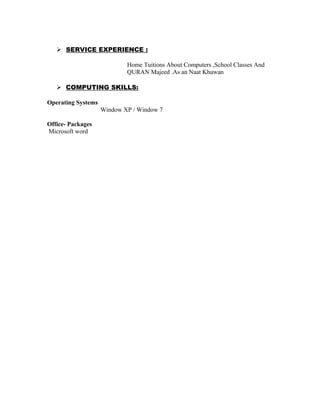 Muhammad Hassan's curriculum vitae provides information about his personal details, education qualifications, professional skills, work experience tutoring students, and computing skills with Microsoft Windows and Word. He completed his SSC in 2010 with 72% and FSC pre-engineering in 2012 with 57% and is currently pursuing his BS in Telecom/Electrical Engineering from Sarhad University. His objective is to work for an organization that provides career growth opportunities.