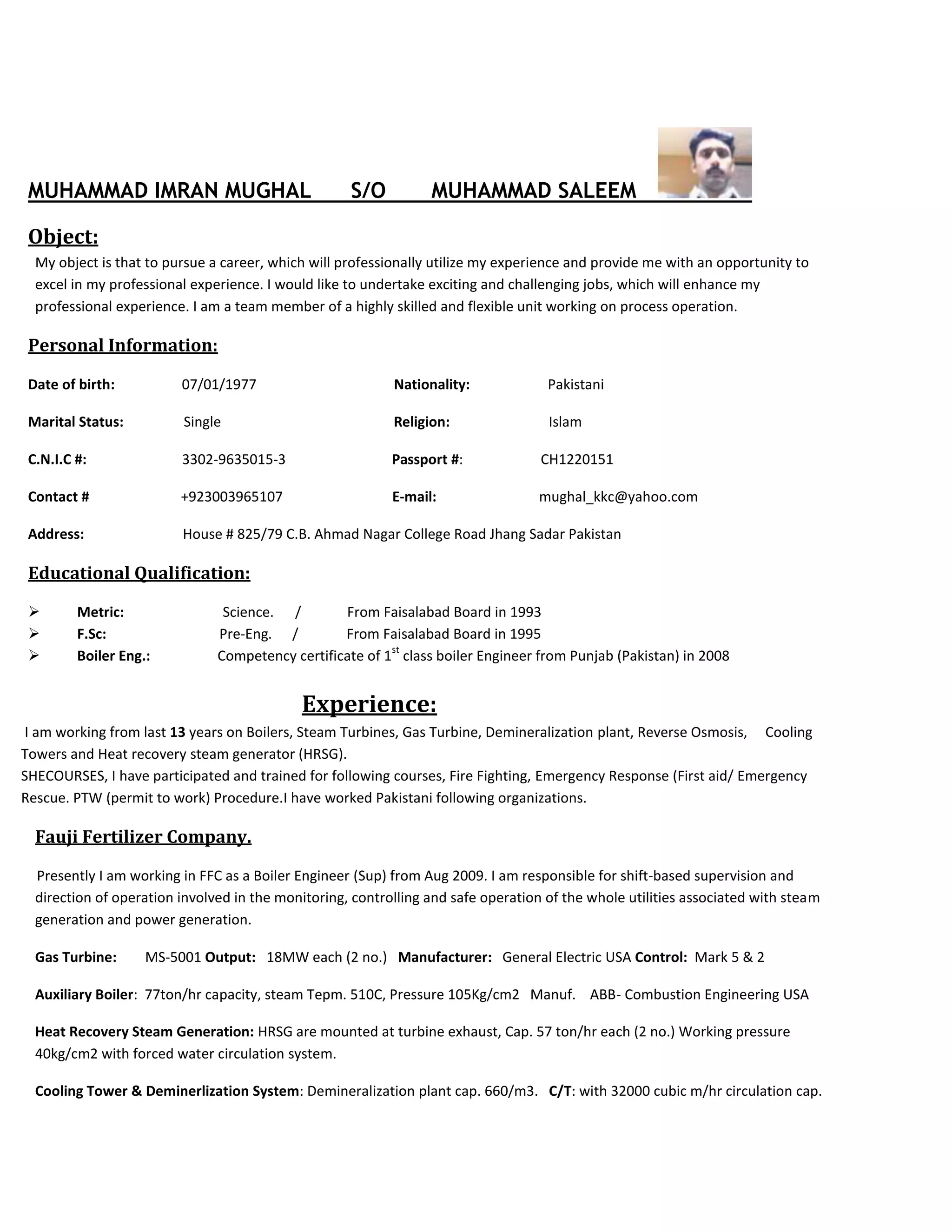 Muhammad Imran Mughal has over 13 years of experience working with boilers, steam turbines, gas turbines, and other power generation equipment. He is currently a Boiler Engineer at Fauji Fertilizer Company, where he supervises the safe operation of steam generation and power generation utilities. Previously he has worked at ICI Pakistan PTA Limited, Olympia Chemicals Ltd, Adam Fabrics Ltd, and Shakarganj Mills Limited in roles involving operation and maintenance of boilers, turbines, cooling towers, and water treatment systems. He has extensive experience with DCS and automation systems including Yokogawa Centum CS 3000 and Siemens S7 PLCs.