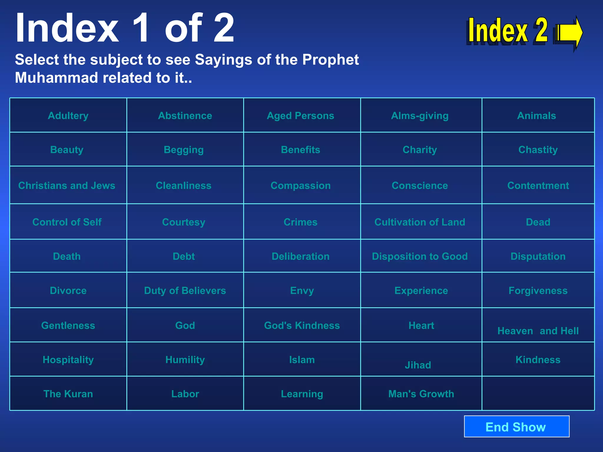 The document contains sayings of the Prophet Muhammad related to various subjects arranged alphabetically. It discusses topics like adultery, abstinence, treating the aged with respect, charity, modesty, compassion, conscience, contentment, self-control and more. The sayings emphasize virtues like purity, kindness, humility and controlling one's desires and tongue.