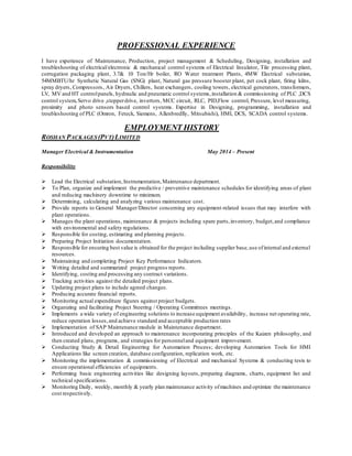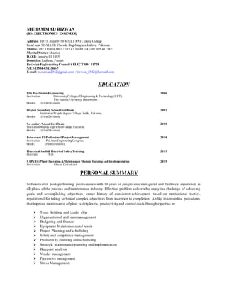 This document provides a summary of Muhammad Rizwan's personal and professional details. It includes his contact information, education history, certifications earned, and over 10 years of experience in maintenance, production, and project management roles in industries like electrical equipment manufacturing and packaging. Some of his responsibilities have included leading maintenance departments, implementing preventative maintenance schedules, and reducing downtime and costs through strategic planning.