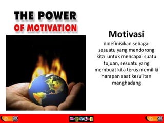 Muhammad SAW adalah motivator terbesar. Motivasi adalah dorongan untuk mencapai tujuan dan memberikan harapan saat menghadapi kesulitan. Dalam Islam, motivasi adalah dorongan untuk taat kepada Allah dan menjauhi larangan-Nya. Al-Qur'an mengajarkan memberikan manfaat untuk orang lain, bukan mencari keuntungan pribadi.