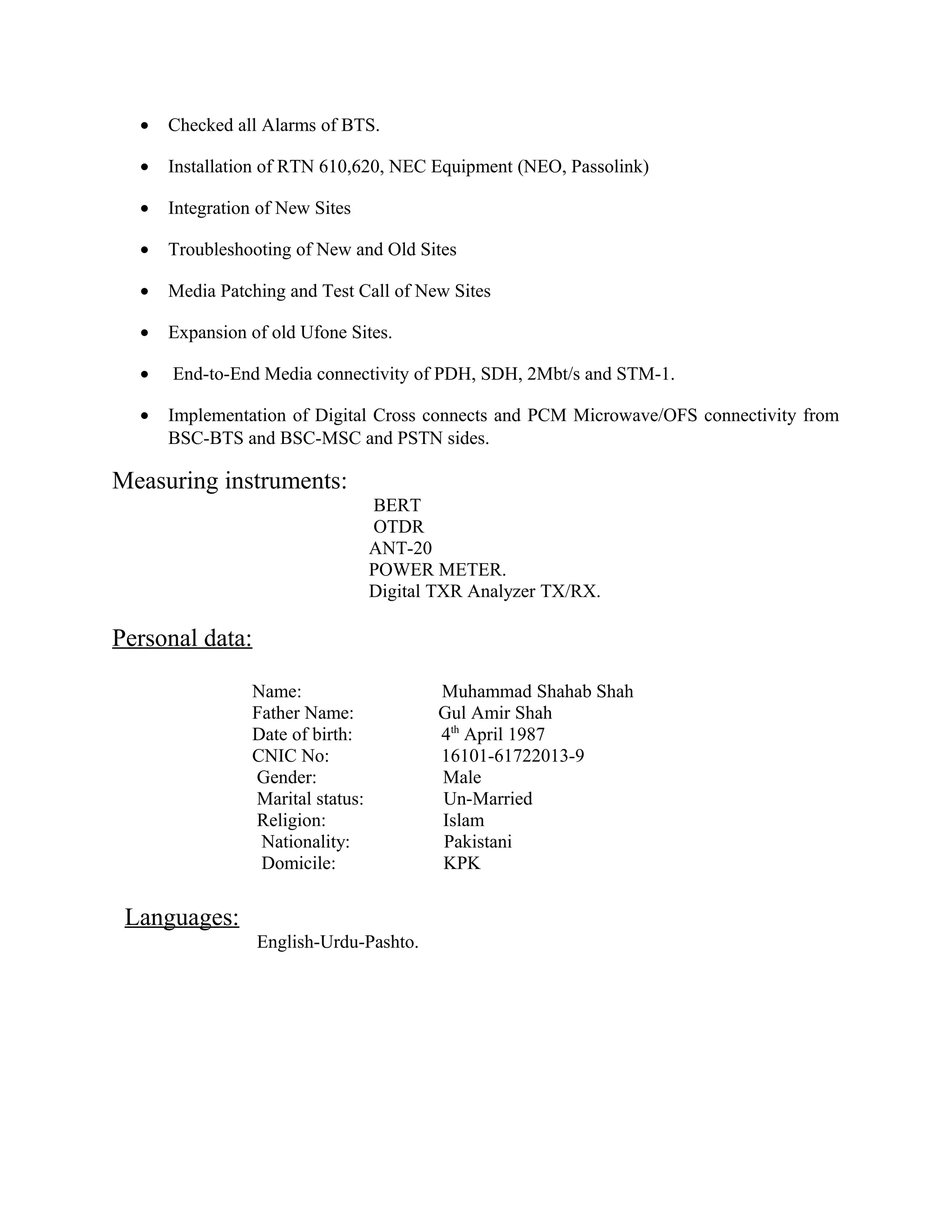 Muhammad Shahab Shah is seeking a challenging job utilizing his technical skills in telecommunications planning and maintenance. He has a Bachelor's degree in Telecom and certifications in computer skills. His experience includes one year interning at Huawei Technologies where he performed tasks like planning microwave and BTS activities, installation of hardware, troubleshooting sites, and connectivity implementation.