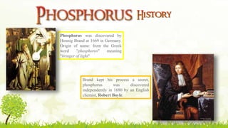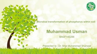 The document discusses the phosphorus cycle and transformations of phosphorus within soil. It notes that phosphorus is essential for life but cannot exist as a gas, and its cycle is the slowest. Within soil, microbes play an important role in mineralizing organic phosphorus compounds into a form plants can absorb through enzymes. They also solubilize insoluble phosphates and precipitate phosphorus compounds. The transformations involve acids, gases, chelators and are impacted by pH, calcium, magnesium, iron and aluminum levels.