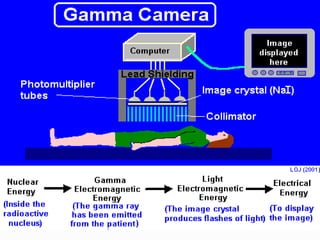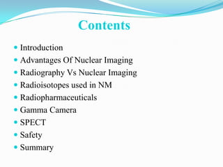 Nuclear imaging uses radioactive tracers and gamma cameras to produce functional images of the body. It has advantages over radiography like examining whole organs at once and providing computerized analysis. Common radiotracers like Tc-99m have short half-lives and emit gamma rays detectable by gamma cameras. These cameras use collimators, scintillation crystals and photomultiplier tubes to convert gamma rays into 2D images. SPECT provides 3D tomographic images by rotating gamma cameras around the patient. Nuclear imaging is useful for assessing organ function but has limitations like low resolution and radiation exposure.