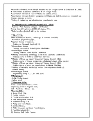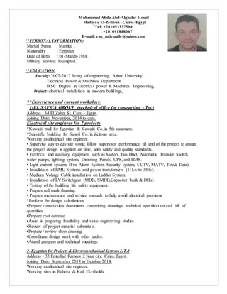 This document contains the resume of Muhammad Abdu Abd-Alghafar Ismail. It outlines his personal details, education, work experience, training, languages, and computer/technical skills. He has over 5 years of experience as an electrical site engineer working on projects in Egypt. His education includes a B.Sc. in Electrical Power and Machines Engineering from Azhar University. He is proficient in English and has skills in AutoCAD, PLC programming, power systems, and more.