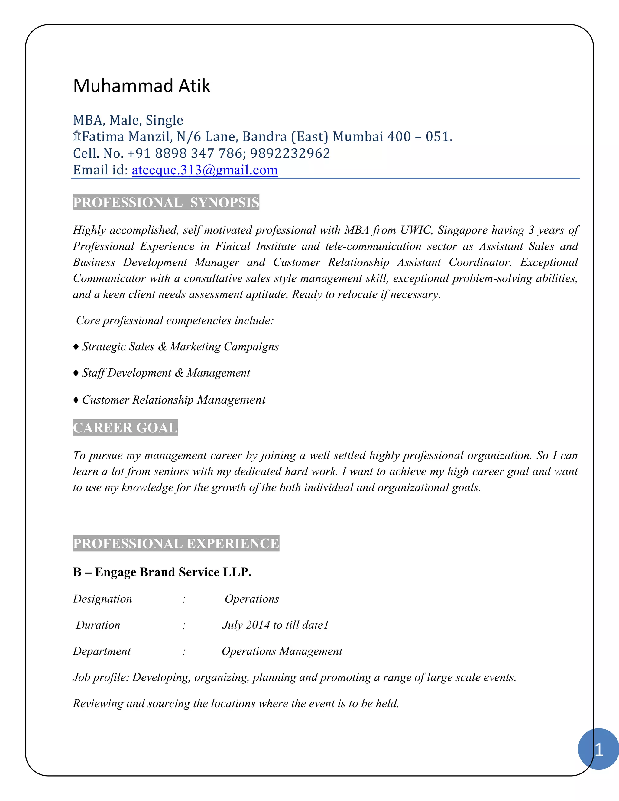 Muhammad Atik is seeking a management position where he can utilize his MBA and 3 years of experience in finance and telecommunications. He has held roles in operations management, customer relations, and business development. His experience includes managing events, restaurants, catering services, and stock broking customer relationships. He is proficient in strategic sales, marketing, staff development, customer relationship management, and operations coordination.