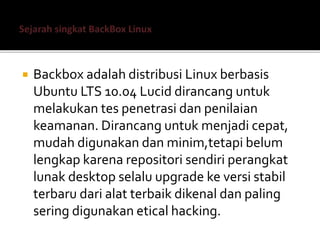 BackBox adalah distribusi Linux berbasis Ubuntu yang dirancang untuk tes penetrasi dan penilaian keamanan. Meskipun mudah digunakan, sistem ini masih memerlukan peningkatan pada repositorinya. Untuk menginstalnya, pengguna dapat mengakses situs web resmi BackBox.