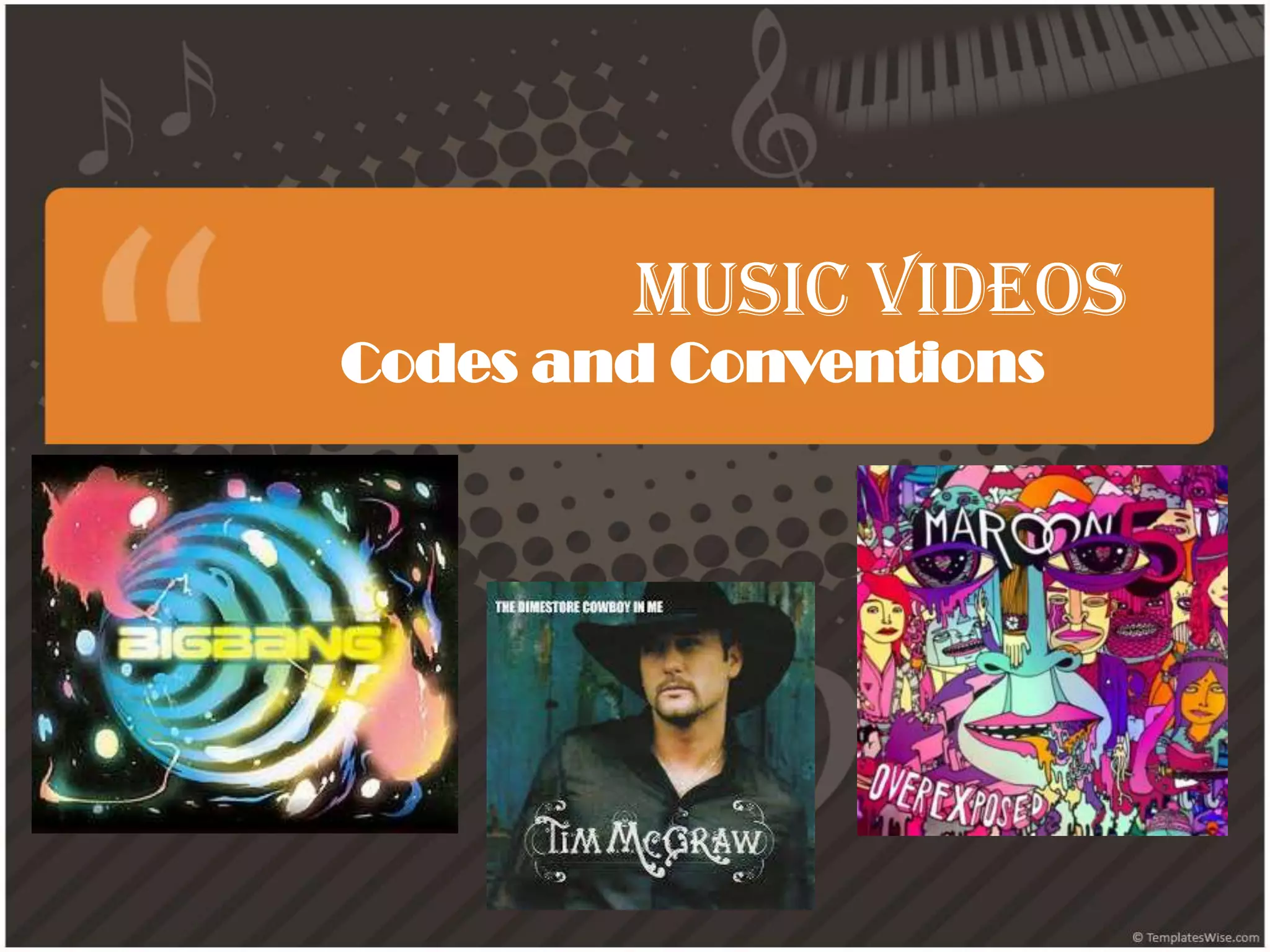 This document discusses codes and conventions in music videos. It defines codes and conventions as systems that create meaning in music videos. There are technical codes like camera angles, shots, and editing, and symbolic codes like mise-en-scene involving props, costumes, and locations. Codes and conventions allow audiences to be familiar with genres and understand music videos. Technical elements like camera shots, movements, and angles construct meaning, as do symbolic elements of mise-en-scene like props, colors, locations, and facial expressions. Editing, lighting, and sound are also important technical codes that construct meaning and relate the visuals to the music.