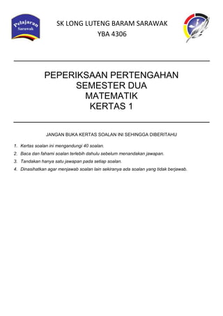 Kertas soalan matematik pertengahan semester dua mengandungi 40 soalan dan peserta diingatkan untuk membaca soalan dengan teliti sebelum menjawab dan hanya menandakan satu jawapan sahaja untuk setiap soalan.