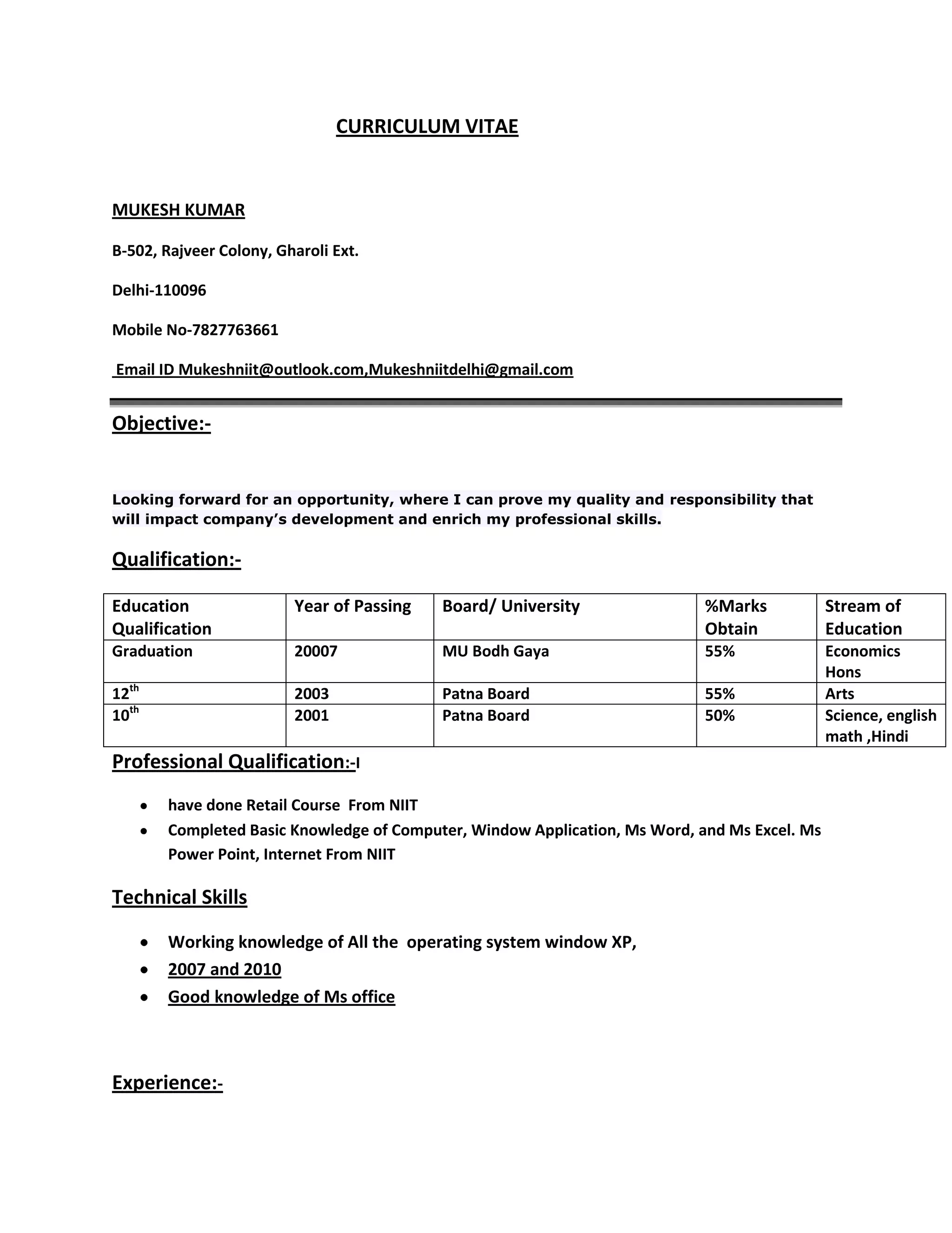 Mukesh Kumar is seeking an opportunity to prove his quality, responsibility, and professional skills. He has a retail course from NIIT and basic computer skills. He has 10 months experience as an Assistant Trainer at NIIT Yuvastar and 1.5 years as a Marketing Executive at NIIT Foundation. His strengths include leadership, teamwork, working under pressure, communication, and time management skills. He has a Bachelor's degree in Economics from MU Bodh Gaya.