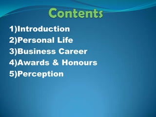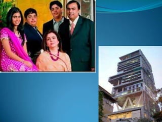 Mukesh Ambani is the Chairman and Managing Director of Reliance Industries Limited, the largest private sector company in India. He owns 44.7% of RIL, making him India's richest person and the second richest person in Asia. Ambani has retained his position as the richest Indian for five years in a row. He has extensive business experience growing RIL and leading initiatives such as the largest oil refinery in India. Ambani lives with his family in Antilia, the most expensive home in history valued at over $1 billion in Mumbai.