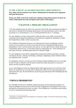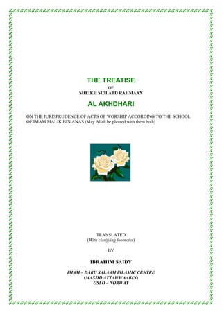This document provides guidance on acts of worship according to the Maliki school of jurisprudence. It begins by outlining primary obligations for Muslims, such as proper faith, knowledge, and avoiding prohibitions. It then discusses ritual purification (tahara), including the obligatory and recommended acts of wudu (ablution) and things that invalidate it. It also covers ghusl (full-body bath), things prohibited without purification, and guidelines for proper worship. The document instructs Muslims on correctly performing acts of worship and maintaining ritual purity according to the Maliki madhhab.