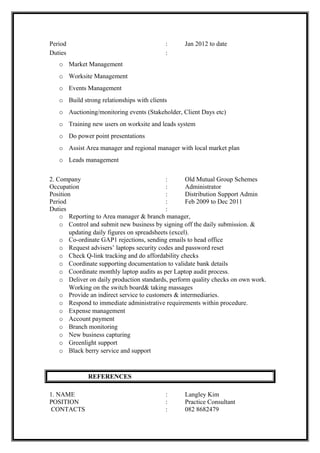 Dingane Mulanga's curriculum vitae provides details about his personal and contact information, educational qualifications, work experience, and references. He has a matric certificate from 2005 and qualifications in long term insurance and marketing support administration. His work experience includes roles as a marketing practitioner at Old Mutual Group Schemes since 2012 and previously as an administrator from 2009 to 2011. He lists responsibilities in both roles including market management, relationship building, event coordination, training, and administrative duties. References are provided from a practice consultant, regional manager, and branch manager from Old Mutual.