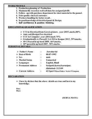 Surya Mani is seeking a challenging position where he can utilize his technical, problem-solving, communication, team-building, and conflict management skills. He has over 3 years of work experience in manufacturing and quality roles. His educational qualifications include a diploma in electrical engineering, CAD training, and a bachelor's degree. He is looking to enhance his skills and advance within an organization.
