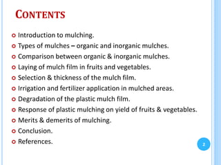 The document discusses the role of mulching in crop production. It describes various types of mulches including organic mulches like grass, straw and sawdust, as well as synthetic mulches like black plastic, clear plastic and degradable plastic films. The document outlines the steps for laying mulch films in fruit crops and vegetable crops, including sizing the film, cutting it, cleaning the area, and fixing the film around plants. Mulching is beneficial as it conserves soil moisture, lowers soil temperature, and reduces weeds.