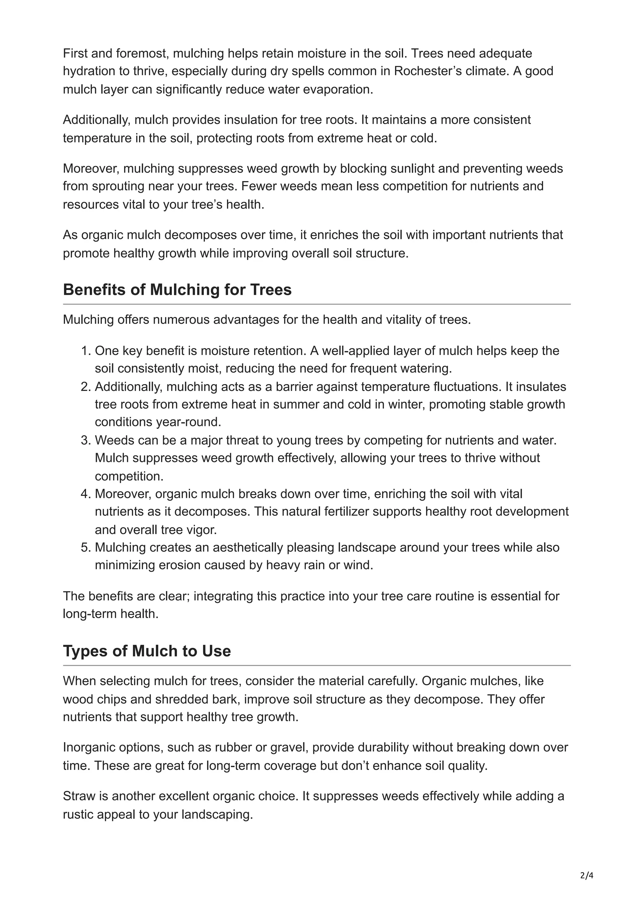 In Rochester, NY, where our climate presents unique challenges for tree health, proper mulching practices become vital. Not only does it help with moisture retention and temperature regulation, but it also adds nutrients back into the soil. And let’s not forget about those pesky weeds! A good layer of mulch serves as an excellent barrier against them.