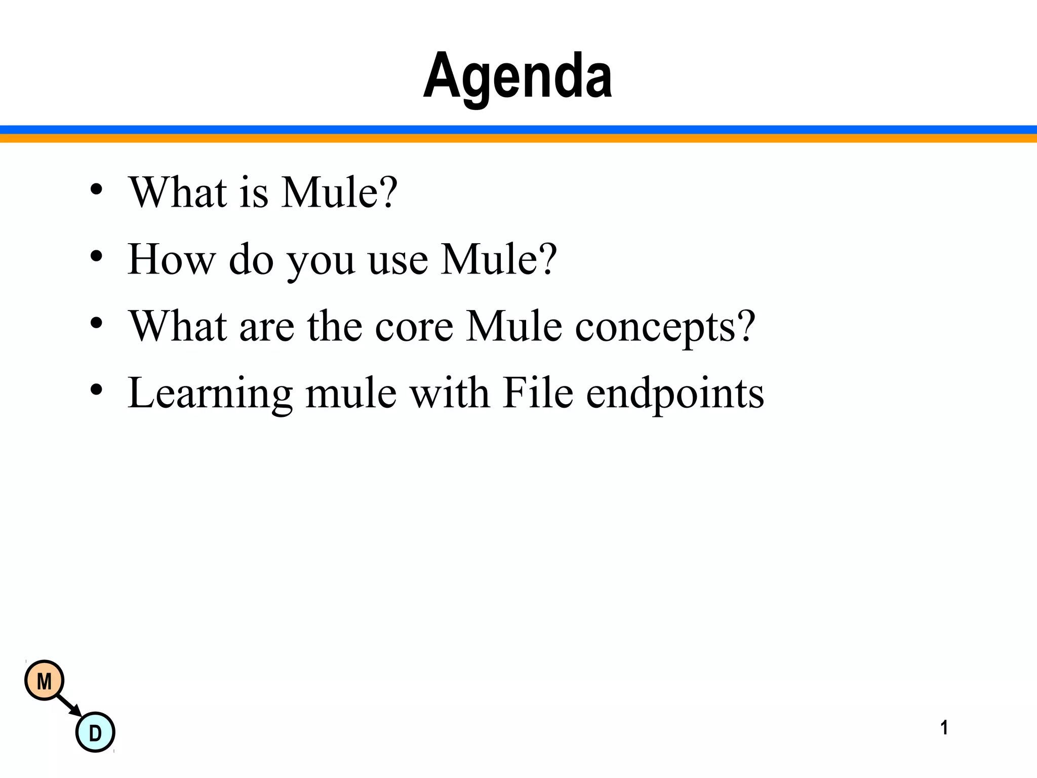 This document provides an overview of Mule, an open-source enterprise service backbone. It discusses key Mule concepts like the universal message object, transports, connectors, routers, filters, transformers and the Mule event flow. It also covers how Mule uses staged event-driven architecture and Java NIO for advanced technologies. Specific examples are provided around using Mule with file endpoints and for XML pipelines. The document concludes with a discussion of exception handling in Mule.