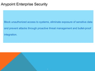 Anypoint Enterprise Security provides tools to secure MuleSoft integrations including restricting access by IP address, preventing replay attacks using message expiry policies, and detecting message tampering using CRC. It also allows encrypting message payloads, storing credentials encrypted, and ensuring data integrity with digital signatures. Additionally, it leverages standards like SAML, OAuth, and WS-Security for authentication and uses LDAP for authorization to APIs and SOA endpoints.