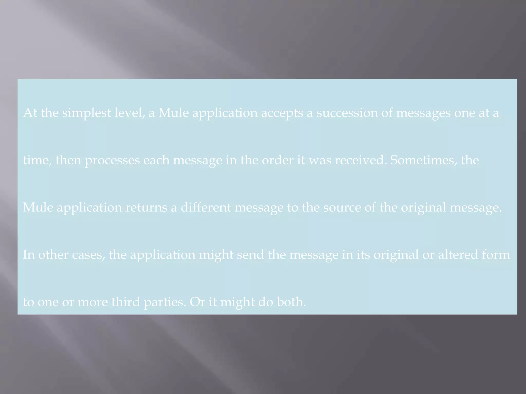 A Mule application processes messages one at a time in the order received. It can return a response message to the original source, send the message to third parties, or discard messages that do not meet criteria. Advanced Mule applications support more complex processing using multiple queues, clusters, object stores, and other features. Mule supports building applications as flows, which arrange pre-built blocks into a sequence, or as patterns for common use cases. Flows provide the most flexibility by allowing exact configuration of message processing steps.