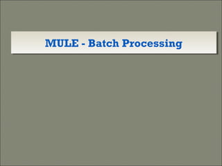 Batch processing in Mule allows splitting messages into individual records, performing actions on each record in parallel, and reporting results. It is useful for integrating or synchronizing large datasets between systems, extracting/transforming/loading data into a target system, and handling large volumes of incoming API data. Mule's batch jobs feature introduced in 2013 simplifies processing massive amounts of data through parallelization, record-based reporting and error handling.