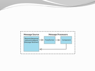 - The basic building blocks of flows are message sources that receive messages, transformers that convert message formats, and components that contain business logic. Messages move through processors, filters, and routers that route messages down different paths.
