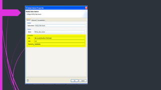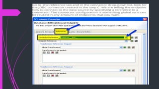 The document discusses how to connect to and query databases using JDBC and Mule Studio. It provides steps to import database drivers, create a MySQL data source configuration, configure a JDBC connector to use that data source, and create inbound or outbound JDBC endpoints in a Mule flow to execute SQL queries and statements.