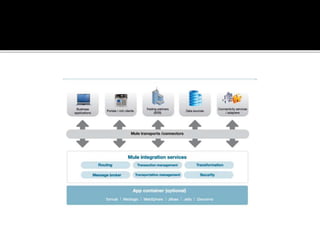 Mule ESB is a lightweight Java-based enterprise service bus (ESB) and integration platform that allows developers to connect applications together quickly and easily. It acts as a transit system for carrying data between applications within an enterprise or across the Internet. Mule ESB includes powerful capabilities such as supporting over 30 protocols, simplified POJO-based programming, multiple access points, and extensive out of the box data transformations. A key advantage is that it allows different applications to communicate regardless of the technologies used.