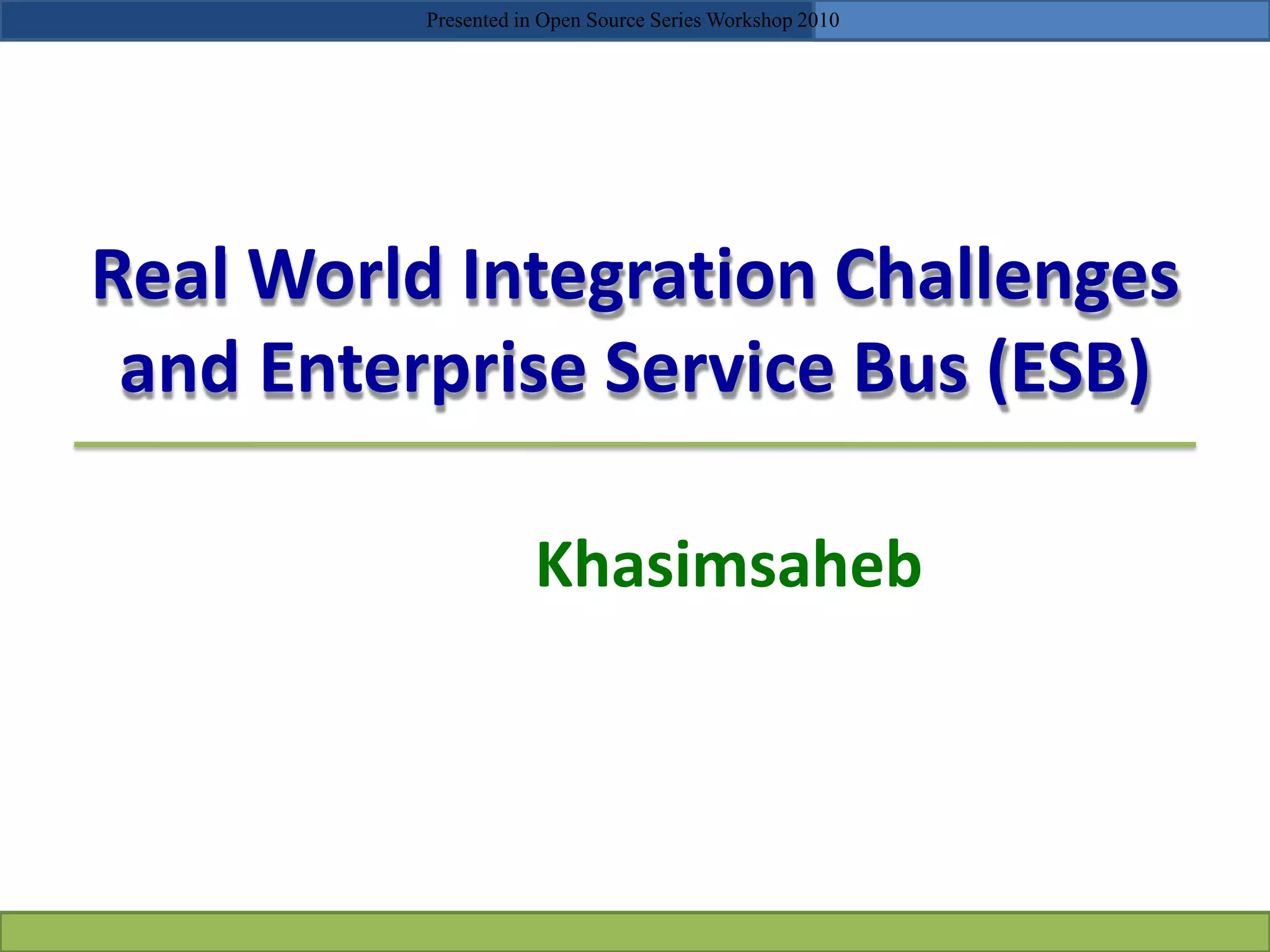 The document discusses software integration challenges and how an Enterprise Service Bus (ESB) addresses them. It describes integration patterns like peer-to-peer and client-server architectures. The Service Oriented Architecture (SOA) approach defines discrete services that can be combined to meet business needs. An ESB provides intelligent routing, reliable messaging, and data transformation to connect different applications. Mule is an open source ESB that provides a lightweight platform for easy integration across various technologies using different connectors. Examples demonstrate how Mule can be used to create a loan broker application that integrates systems.
