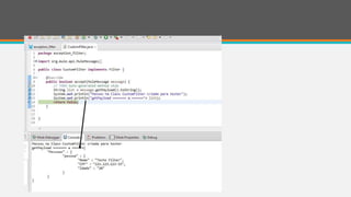 This document provides an overview of a Mule Flow that includes a custom filter. It shows how to configure an XML flow definition that receives an HTTP request, logs the payload, converts the XML payload to JSON, and passes it through a custom Java class filter. The flow demonstrates how to build a custom filter that can manipulate the payload as needed within a Mule application.