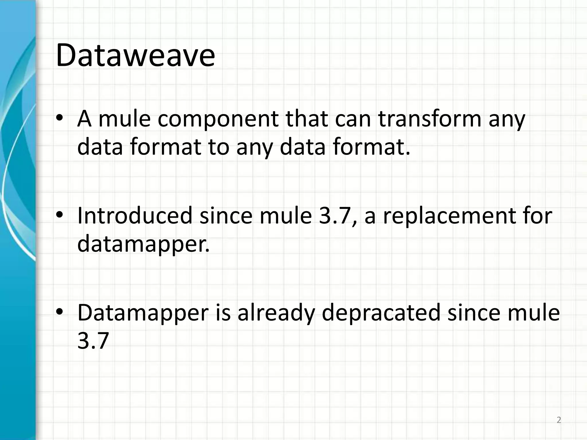 Dataweave is a Mule component that can transform data between any formats like JSON to XML. It uses a JSON-like scripting language and was introduced in Mule 3.7 as a replacement for the deprecated datamapper component. Dataweave retains the drag and drop features of datamapper but coding the transformation manually has no difference. An example shows how a JSON data can be transformed to XML using a Dataweave script, generating the output XML.