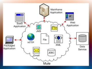 Mule ESB is a lightweight, Java-based integration framework that allows applications to connect and exchange data regardless of technology. It uses a service-oriented architecture to easily integrate existing systems. Mule ESB is highly scalable, vendor-neutral, and supports a variety of integration patterns and formats. It provides reusable components, separates business logic from integration logic, and offers administration tools.