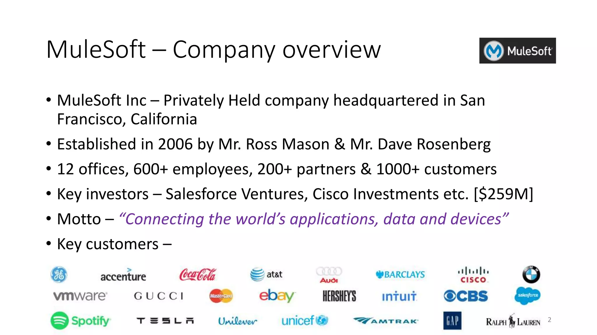 MuleSoft's Anypoint platform is an integration platform as a service (iPaaS) that includes tools like API Manager, API Portal, API Gateway, API Designer and connectors. The platform allows users to design APIs and integration flows using Anypoint Studio and then deploy them to Mule runtime engine for on-premises or cloud-based integration. It also includes services for security, scalability, reliability and high availability as well as management tools to administer APIs and integrations.