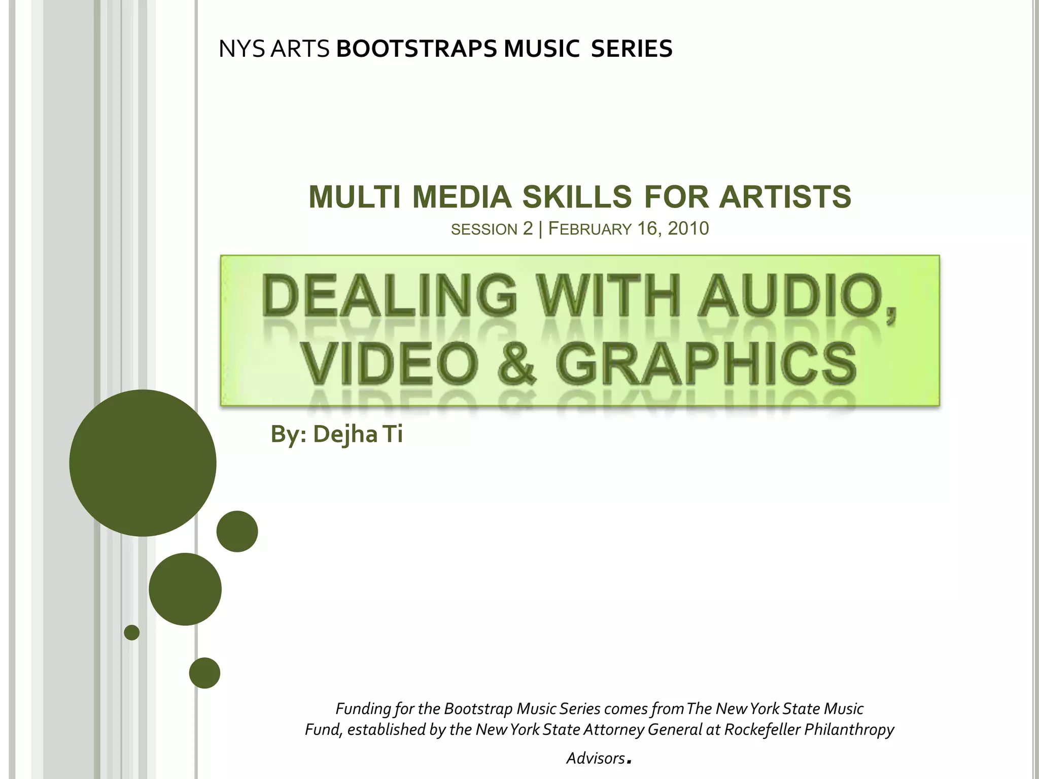 This document provides an overview of a workshop on multi-media skills for artists that covers dealing with audio, video, and graphics. The workshop discusses various platforms for audio and video, formats, codecs, optimization, and file sharing over the web including FTP solutions. Participants are encouraged to ask additional questions on the workshop blog.