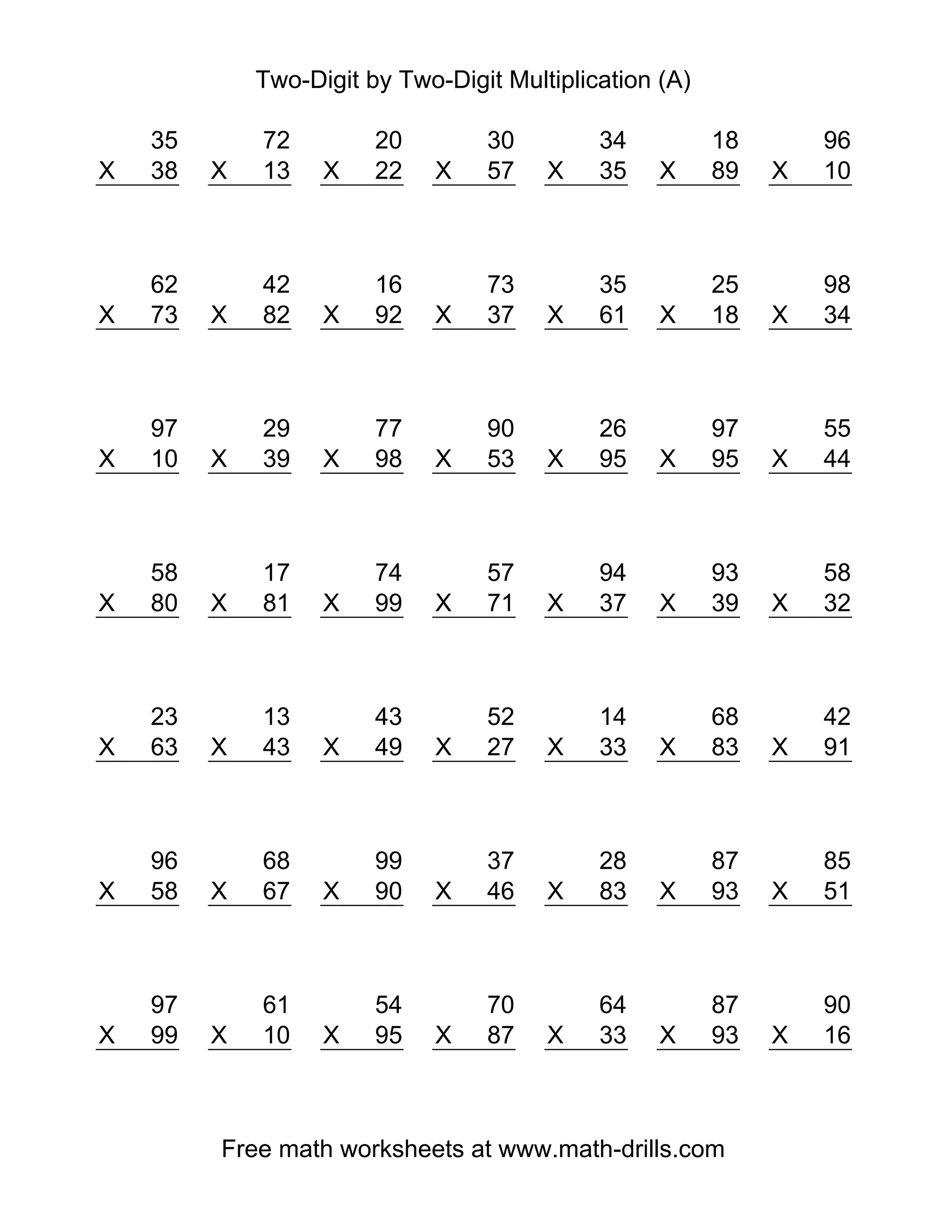 This document provides examples of two-digit by two-digit multiplication problems and their answers. It contains 14 problems with 2-digit numbers being multiplied, showing the step-by-step work and resulting products for each problem. The document encourages visitors to practice similar math drills and skills at a particular website.