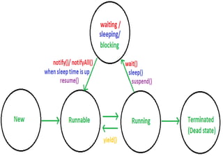 The document explains multitasking, focusing on process-based and thread-based multitasking, highlighting their distinctions. It details the lifecycle of threads, methods to create them, and important concepts like thread priorities, methods for controlling execution, and practical examples in Java. The document aims to educate on multithreading concepts and their applications in programming.