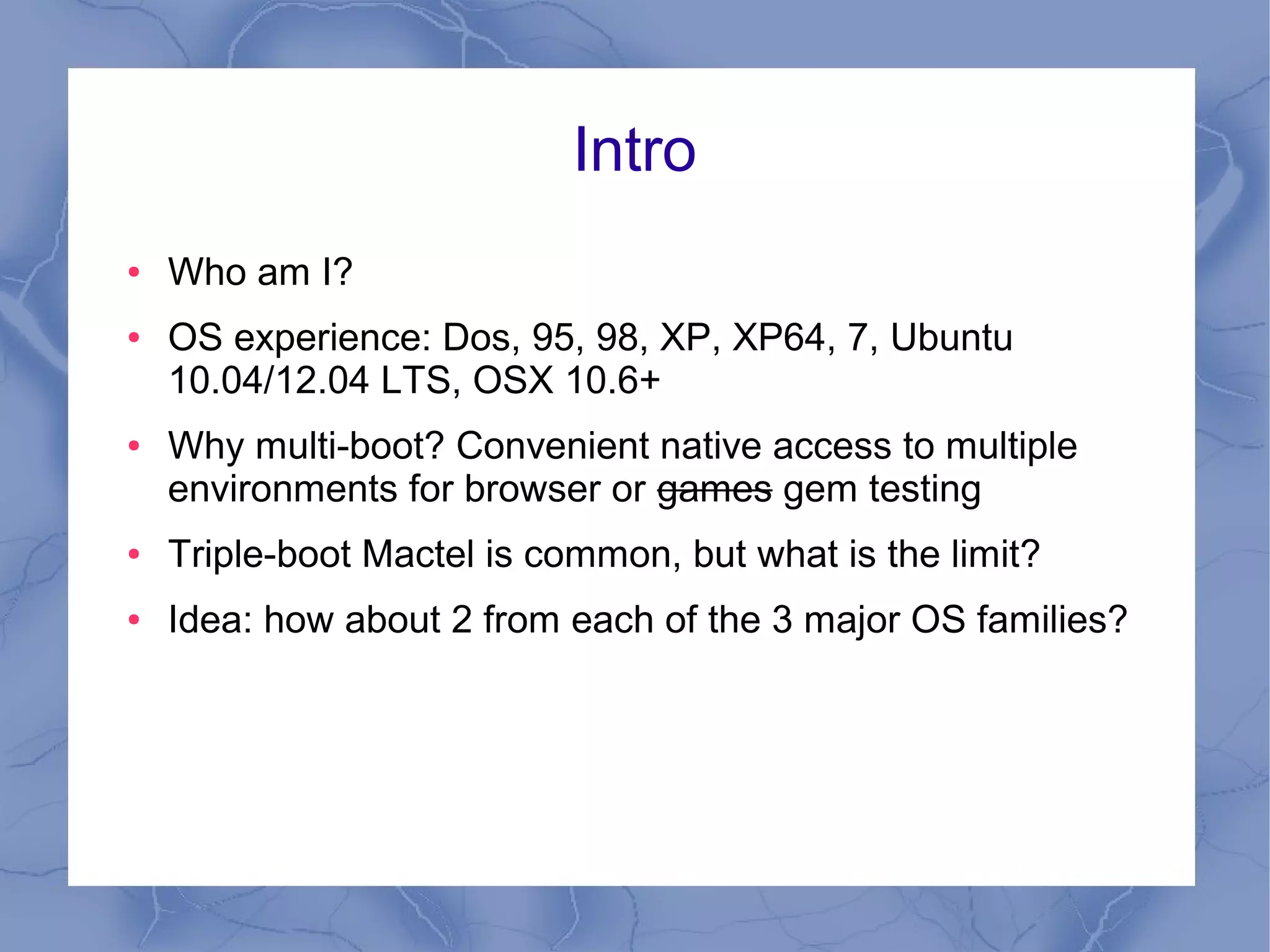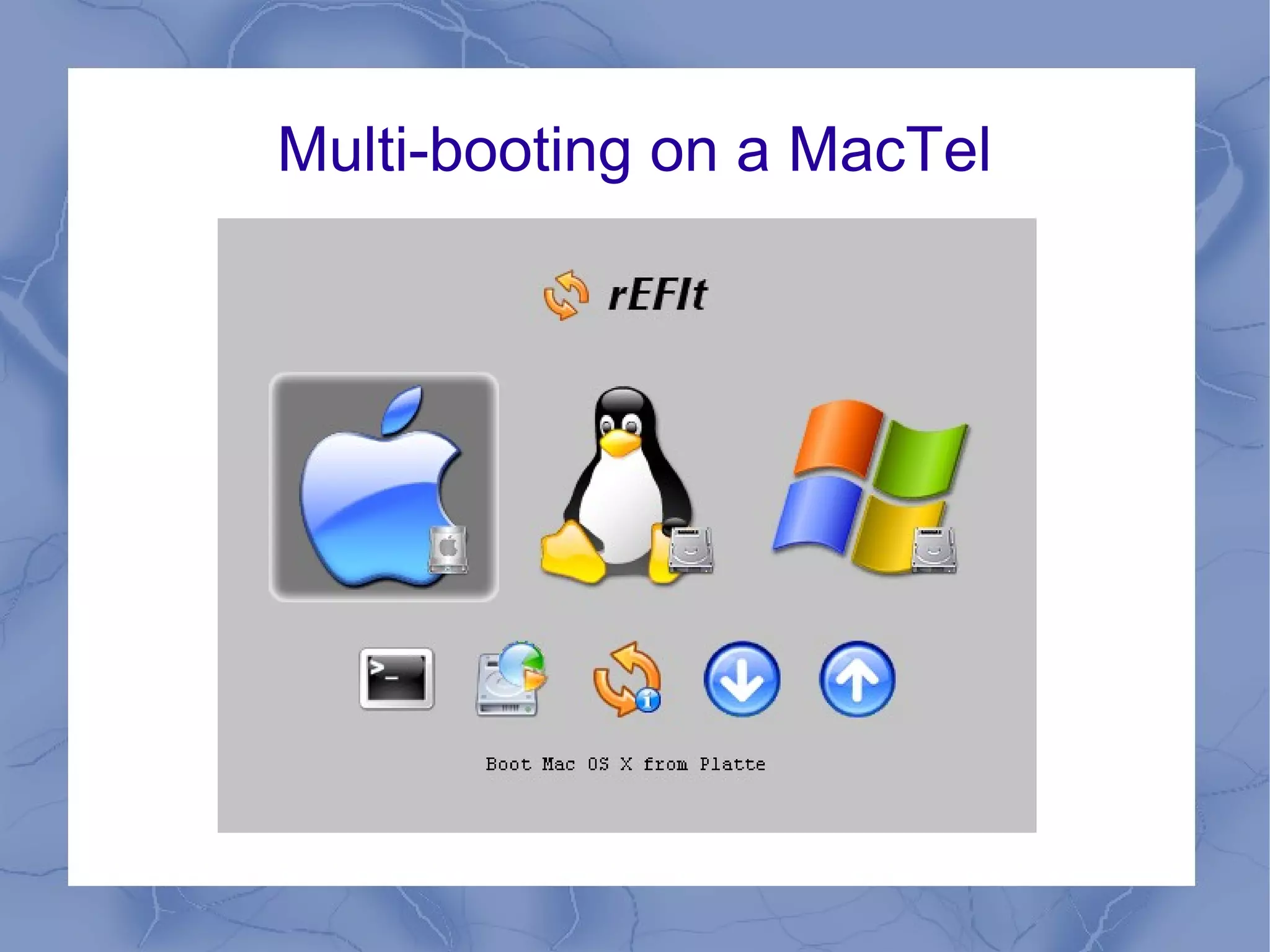 This document discusses multi-booting six operating systems on a Mac computer, including two instances each of macOS, Windows, and Linux. It outlines considerations for the firmware, partitioning schemes, and tools needed. The proposed method is to create partitions using the Mac's Disk Utility, install Refit and Gdisk, then install each OS in a specific partition, with Windows requiring MBR instead of GPT. Linux distributions will use Grub2 to boot between them by recognizing other Linux partitions without separate bootloaders. The goal is theoretical multi-booting of 6+ systems with enough disk space and patience.