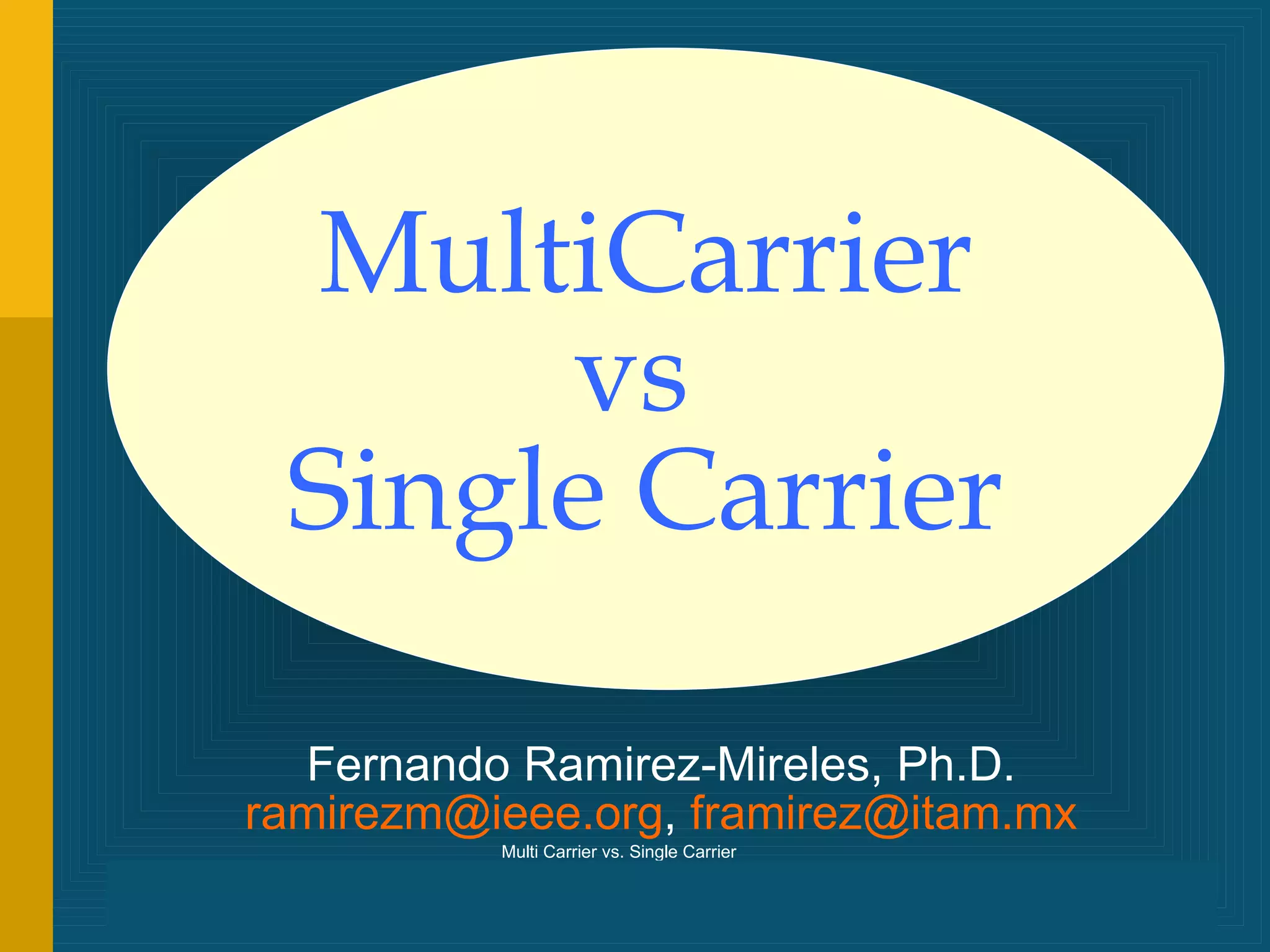 The document compares multi-carrier (DMT) and single carrier modulation techniques. DMT divides the available spectrum into multiple sub-carriers, each with a low symbol rate, allowing different modulation schemes per sub-carrier. Single carrier modulation uses a single carrier to transmit all data simultaneously. DMT offers higher bandwidth efficiency and throughput through bit loading and simpler equalization, while single carrier modulation provides simpler implementation through a single equalizer but lower spectrum utilization. The author is Fernando Ramirez-Mireles, a professor specializing in digital signal processing and communications engineering.