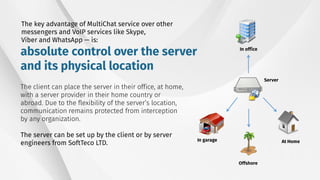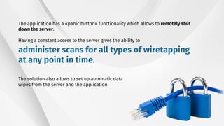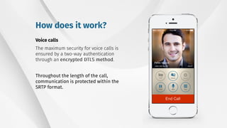 The document discusses the architecture of a communication system using XMPP protocol for messaging, focusing on features like multi-chat and secure audio channels. It mentions various components such as ejabberd server, STUN server, and firewall configurations. The communication is encrypted using DTLS and TLS 1.2 to ensure secure data transmission between clients.