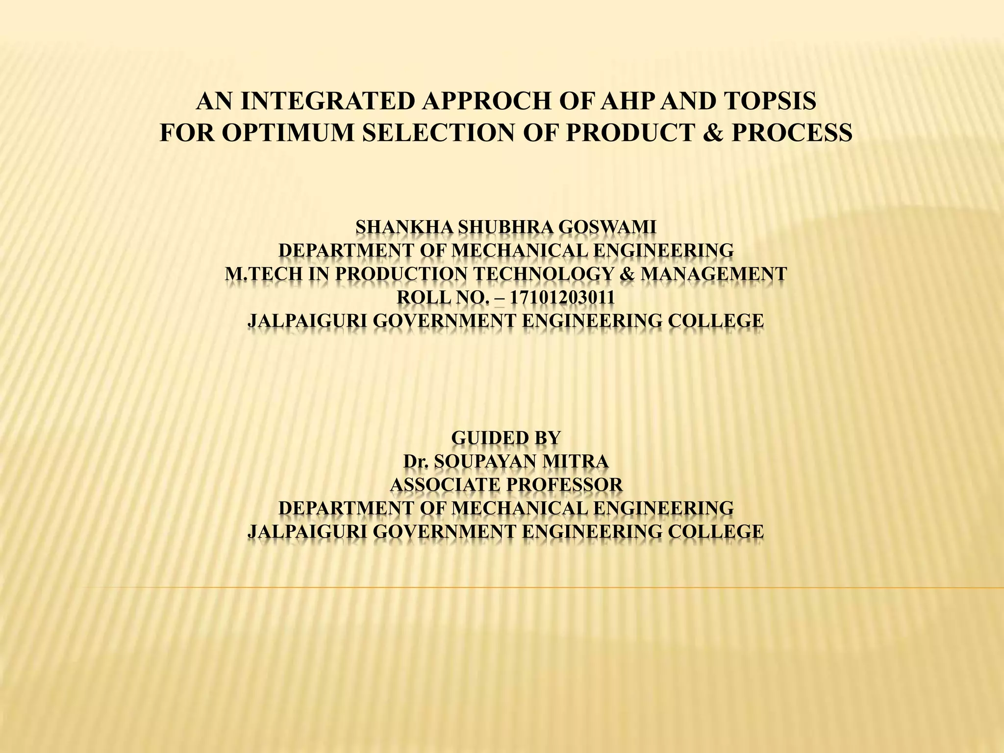 This document presents a study on optimizing product and process selection using an integrated AHP-TOPSIS multi-criteria decision-making approach, focusing on the selection of domestic refrigerators. It details the methodology of AHP for evaluating and prioritizing alternatives based on various criteria, including size, star rating, door type, cooling technology, and color. The analysis includes consistency checks and ranks different refrigerator models based on consumer preferences gathered from market surveys.