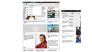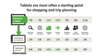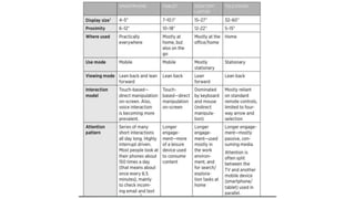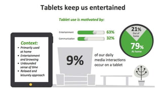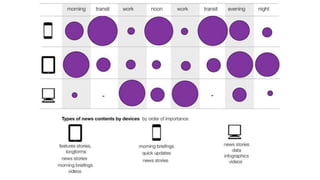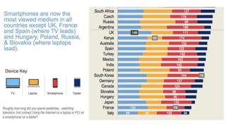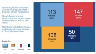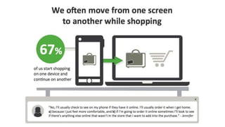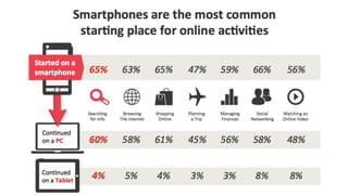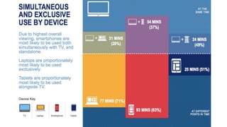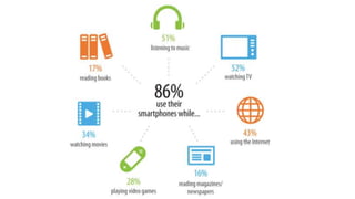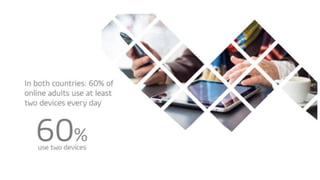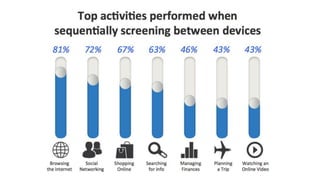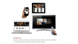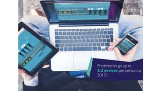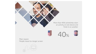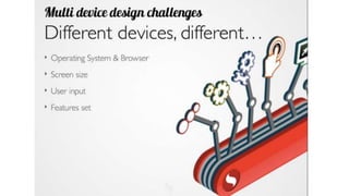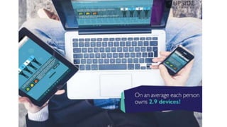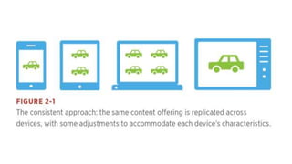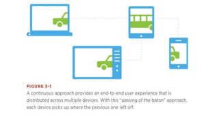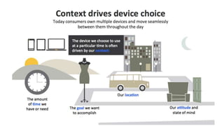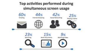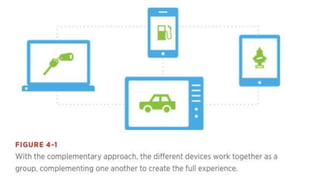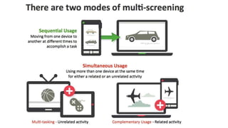 This document discusses multi-device usage and provides strategies for developing consistent experiences across devices. It notes that by 2020 there will be over 24 billion connected devices. While laptops are often used for work, people use different devices for different purposes and contexts. There are three approaches to multi-screening: sequential, simultaneous, and separate. Designing for multiple devices requires consistency while accommodating each device's capabilities. Understanding user personas can help tailor content and experiences for different audiences. Marketers must reach people across all platforms they use. The focus should be removing constraints to center on the user experience. A case study approach is proposed to design multi-device experiences and strategies.