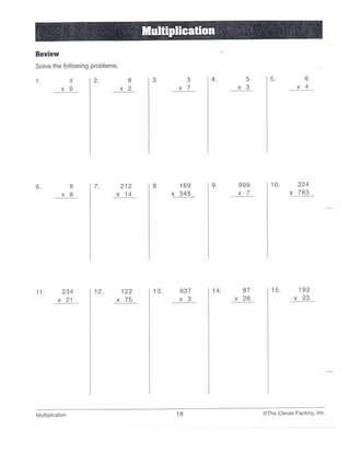 This document is a vocabulary review sheet for multiplication and division terms. It contains key terms like factor, product, divisor, dividend and quotient along with their definitions and examples. The terms are defined in the context of multiplication and division problems to help students understand how to use each term properly.