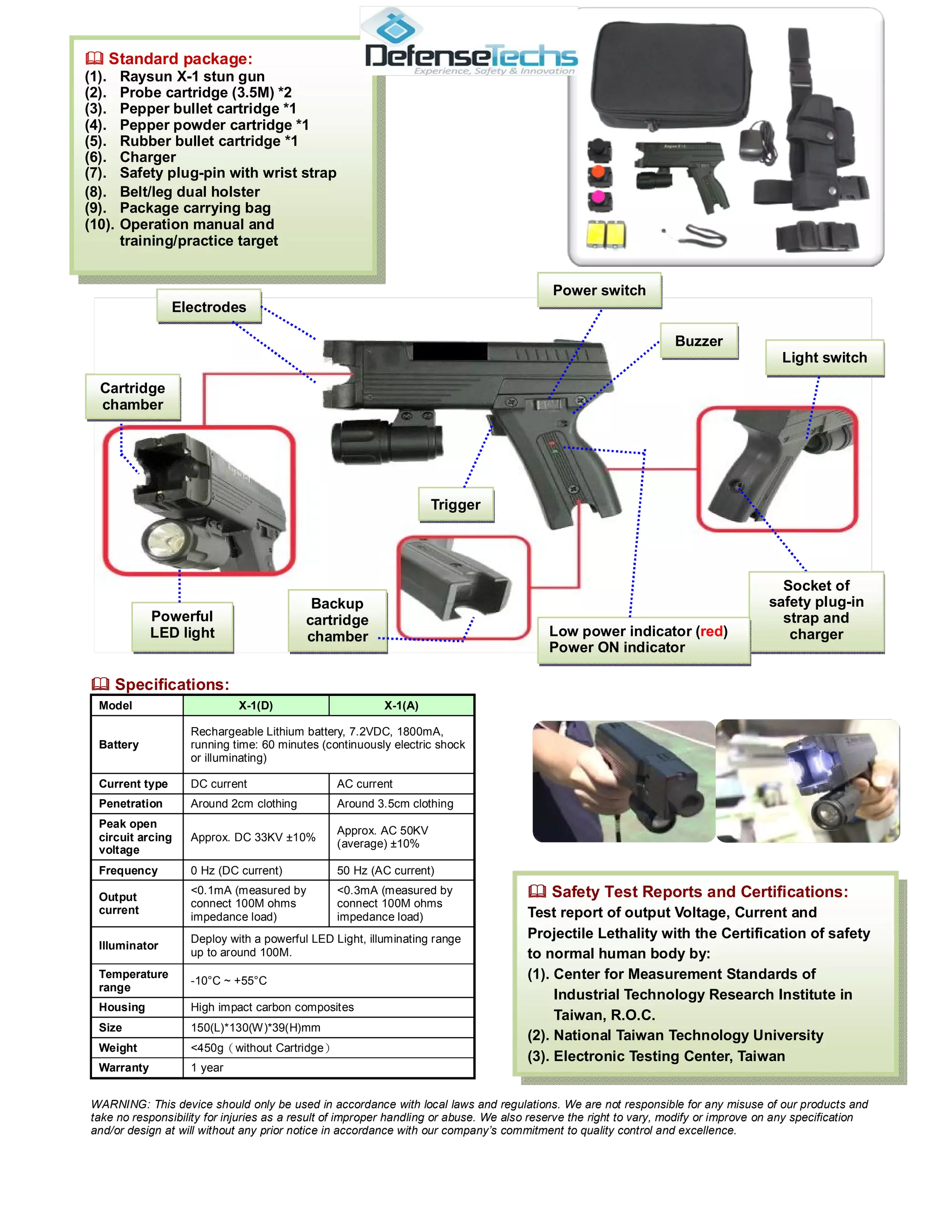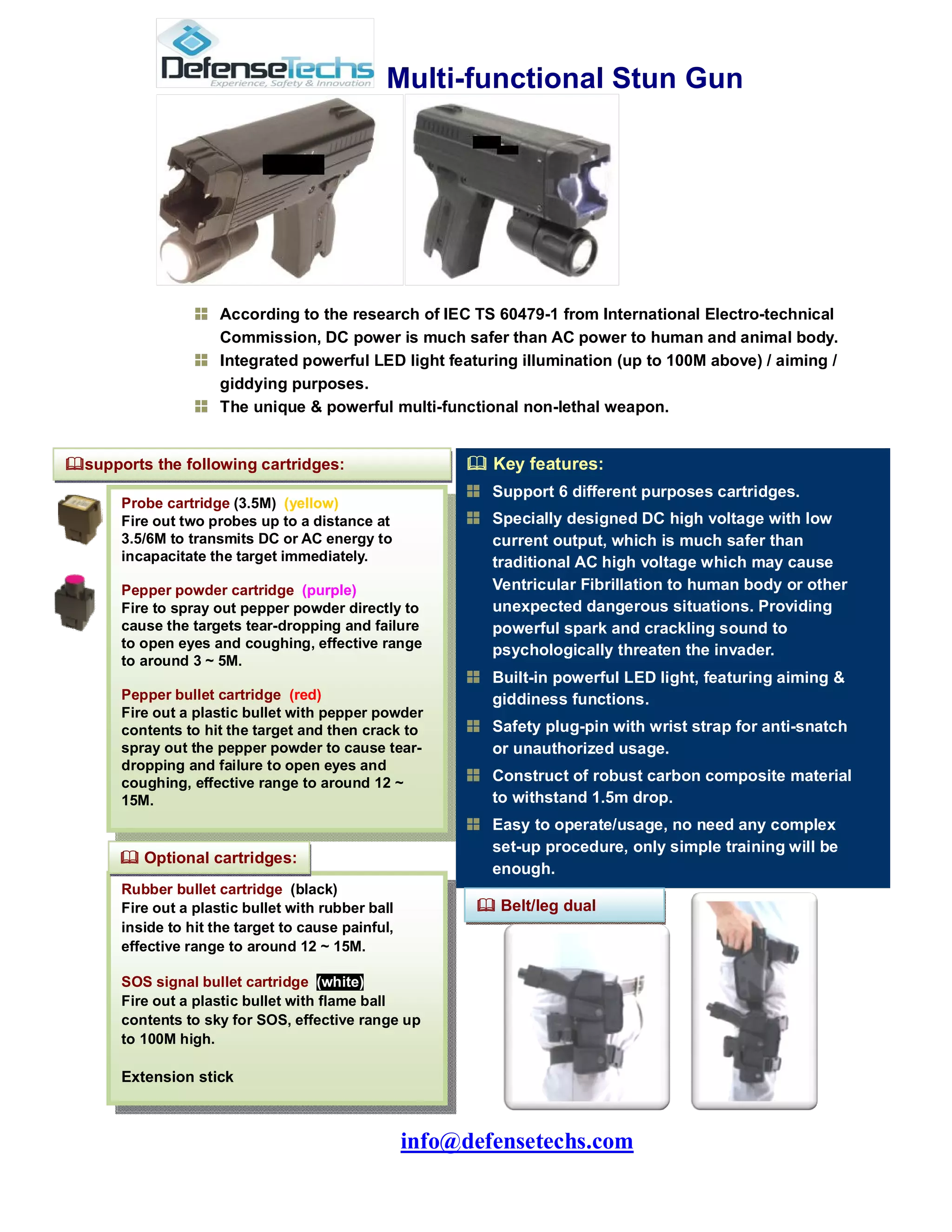 The multi-functional stun gun supports 6 different cartridges, including probe, pepper powder, pepper bullet, rubber bullet, and SOS signal cartridges. It uses a specially designed DC current that is safer for human bodies than AC current. It has a powerful LED light and can incapacitate targets up to 15 meters away depending on the cartridge used. Safety features include a safety plug, wrist strap, and robust carbon composite housing.