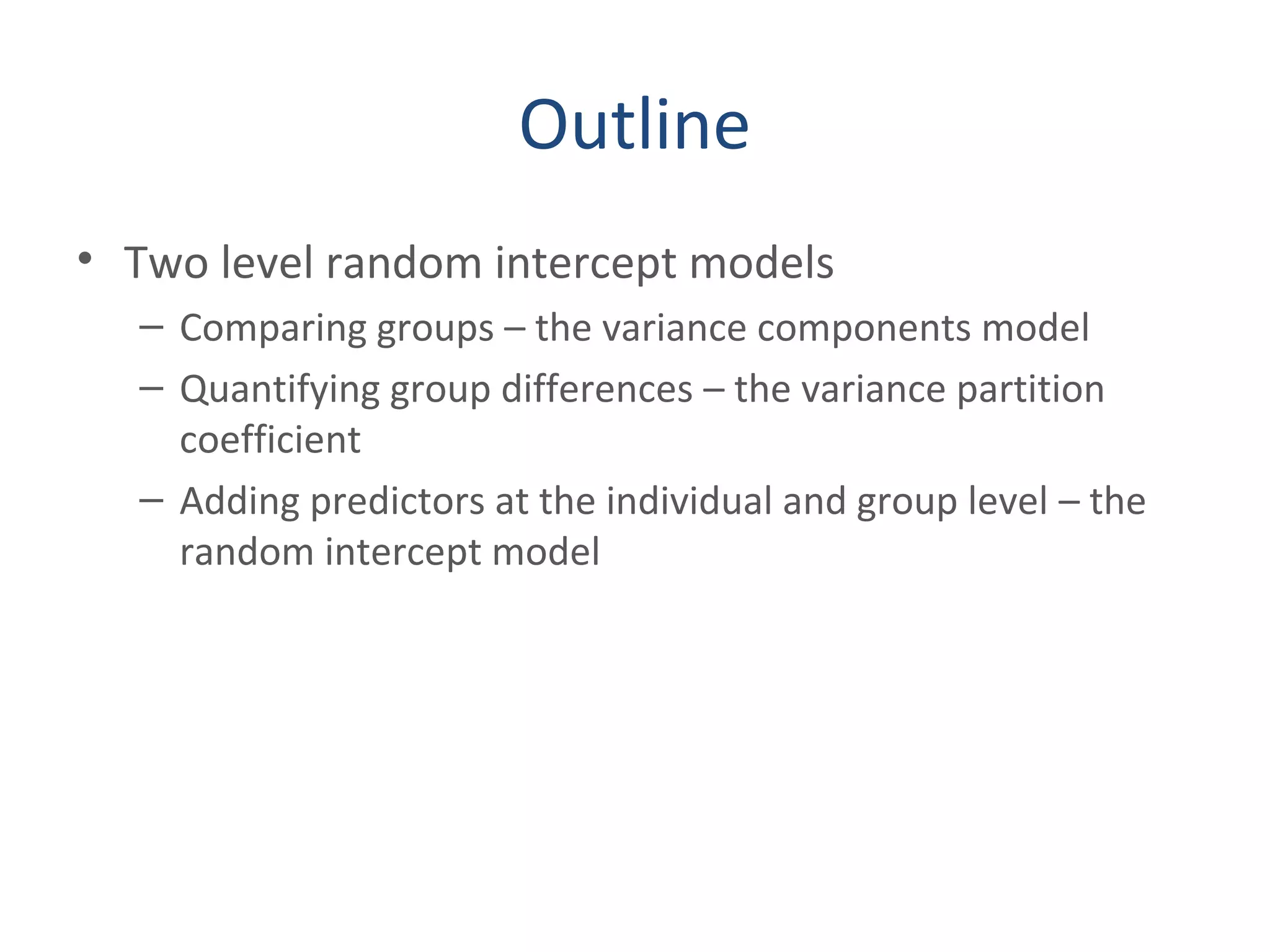 This document introduces two-level random intercept models and variance components models used in multilevel analysis, highlighting their application in group comparisons and variance partitioning. It explains the structure of these models, focusing on the impact of group-level differences and the inclusion of explanatory variables, with an example of fear of crime across neighborhoods. Additionally, it provides resources for further information on related methodologies and data sources.