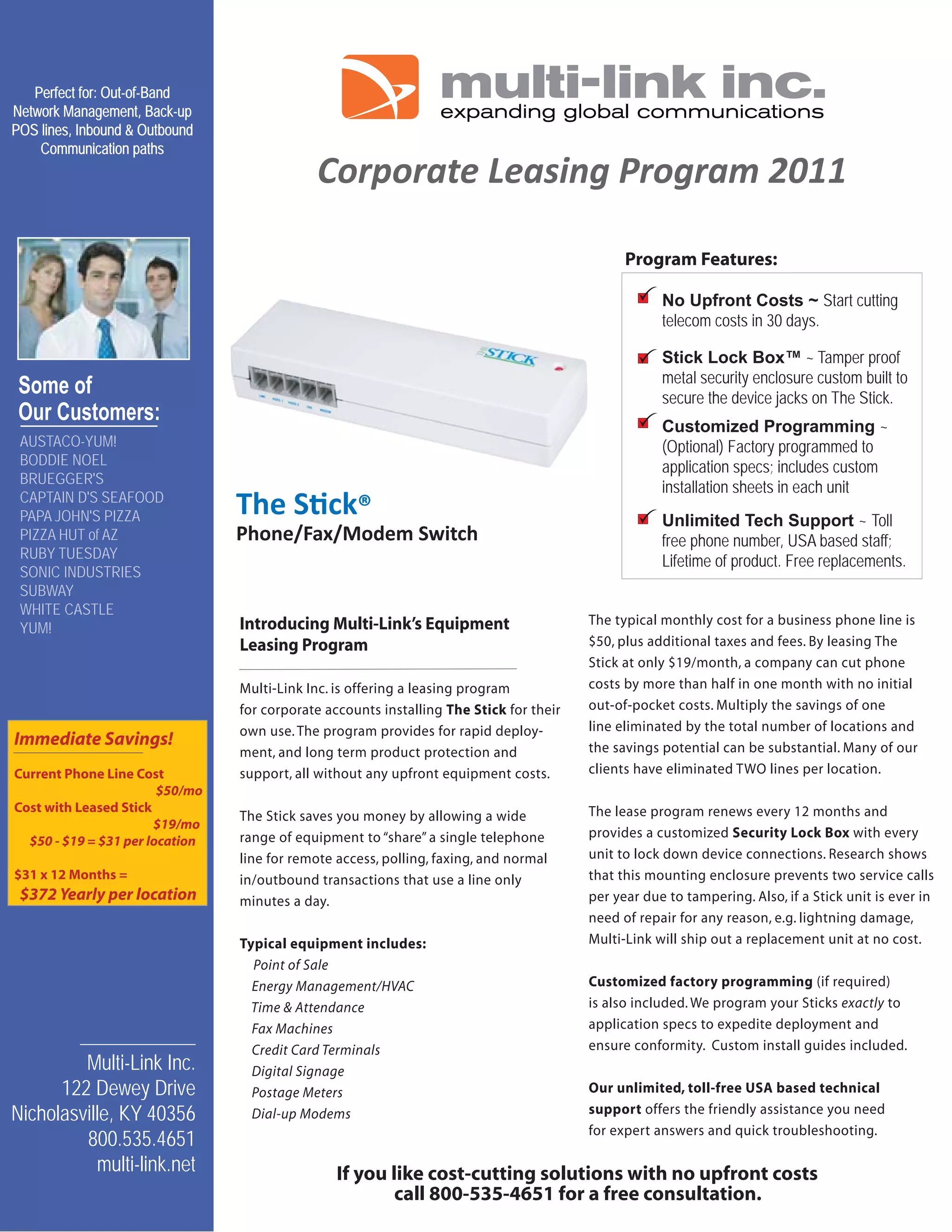 Multi-Link Inc. offers a leasing program for corporate clients to manage out-of-band network operations, allowing businesses to cut phone costs by over half without upfront equipment expenses. The leasing program costs $19/month compared to the typical $50/month business phone line, leading to significant savings across multiple locations. The service includes unlimited tech support, customized device programming, and a security lock box for enhanced device protection.