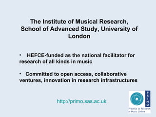 The document discusses the PRIMO project, which aims to create an open access repository of musical research demonstrated through videos, workshops and demonstrations. It addresses the challenges of intellectual property rights and licensing for third-party content within these research demonstrations. Specifically, it examines the UK's Creative Commons licensing and PRS for Music's Limited Online Exploitation Licence, which can allow for some online access and downloading but has limitations regarding international usage, non-musical content, and works still in copyright. The document provides guidance on managing these licensing issues to allow for open access within the constraints of protecting third-party intellectual property rights.