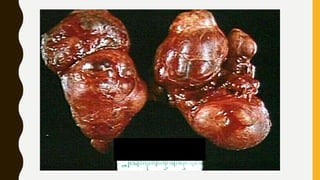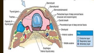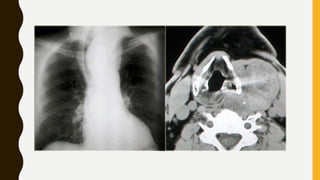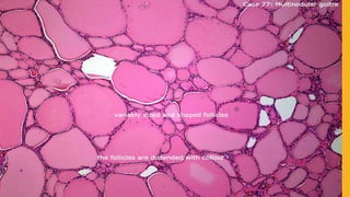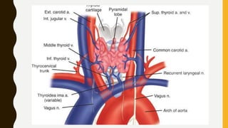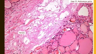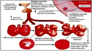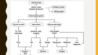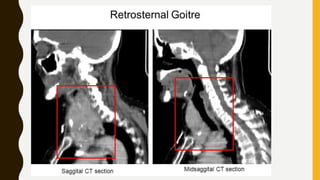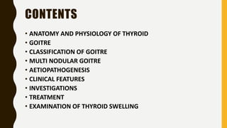 The document provides a comprehensive overview of multi-nodular goitre, covering its anatomy, classification, aetiopathogenesis, clinical features, diagnosis, treatment, and examination techniques. It explains that multi-nodular goitre can be toxic or nontoxic, with various factors contributing to its development, including iodine deficiency and goitrogens. Treatment options vary, with surgery indicated in certain cases, while prevention strategies emphasize the use of iodized salt and managing goitrogen exposure.